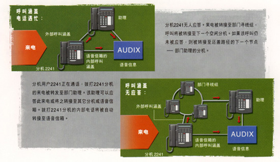 當(dāng)最初的被叫方不能接聽來(lái)話時(shí),呼叫涵蓋功能可將來(lái)話轉(zhuǎn)接到另外一個(gè)分機(jī)。您可以自行規(guī)定判斷是否轉(zhuǎn)接的標(biāo)準(zhǔn)以及涵蓋通道的條件,如無(wú)應(yīng)答、 無(wú)此號(hào)碼、遇忙籌。DEFINITY BCS還可以識(shí)別內(nèi)部和外部呼叫,并為其提供不同的涵蓋通道。