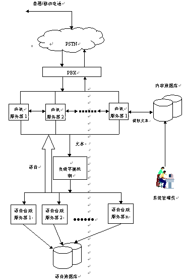 當用戶通過電話向聲訊服務器發(fā)出請求時,聲訊服務器會首先作出分析判斷,然后從內(nèi)容數(shù)據(jù)庫中提取相應的文本信息,經(jīng)過負載平衡機制發(fā)送給語音合成服務器。語音合成服務器在接收到文本后立刻開始合成,同時將合成好的語音發(fā)送回語音服務器,再由語音服務器回傳給用戶。其中內(nèi)容數(shù)據(jù)庫中的信息可以由系統(tǒng)管理員定期進行維護管理。(系統(tǒng)連接結(jié)構(gòu)見流程圖)