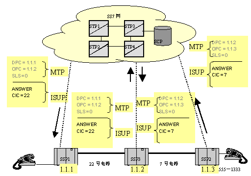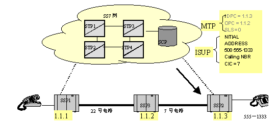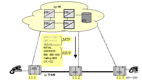 如下圖所示,當(dāng)一個(gè)用戶摘機(jī)并拔被叫號(hào)碼,交換局(SSP1)收集并分析被叫號(hào)碼,分析到被叫不是本局內(nèi)用戶,而是目的信令點(diǎn)編碼為1.1.3交換局的用戶,于是,SSP1在路由表中查找到達(dá)1.1.3的路由,然后用找到的鏈路把IAM消息發(fā)送出去,如圖中箭頭所示。
