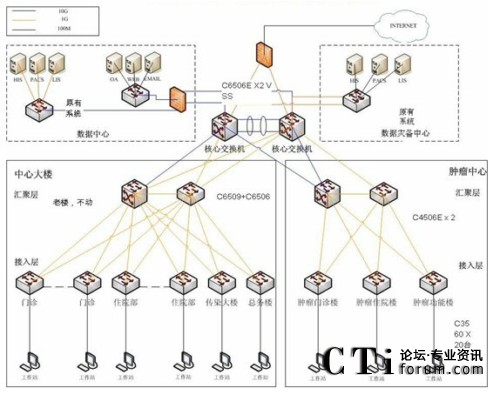 4506E作為新腫瘤大樓的匯聚層和整個醫(yī)院的小災(zāi)備中心,并上連至核心交換機(jī)以節(jié)約投資成本,而接入層繼續(xù)采用思科Catalyst 3560交換機(jī),既方便了管理,也為日后無線網(wǎng)絡(luò)的部署作好了準(zhǔn)備。(網(wǎng)絡(luò)拓?fù)鋱D如下)