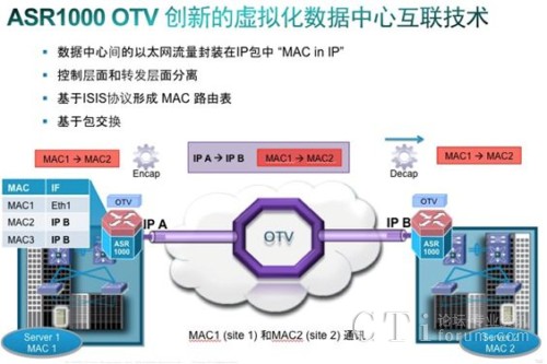 Cisco OTV技術(shù)可以為跨任意傳輸網(wǎng)絡(luò)的二層連接擴展,提供運營優(yōu)化型解決方案。因此,OTV對于分布式數(shù)據(jù)中心的高效部署發(fā)揮著關(guān)鍵作用,有助于實現(xiàn)應(yīng)用可靠性和靈活的工作負載遷移。OTV是一項“MAC in IP”技術(shù)。通過使用MAC地址路由規(guī)則,OTV可提供一種疊加(overlay)網(wǎng)絡(luò),能夠在分散的二層域之間實現(xiàn)二層連接,同時保持這些域的獨立性以及IP互聯(lián)的容錯性、永續(xù)性和負載均衡優(yōu)勢。 圖1說明了這種工作機制。
