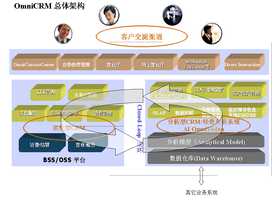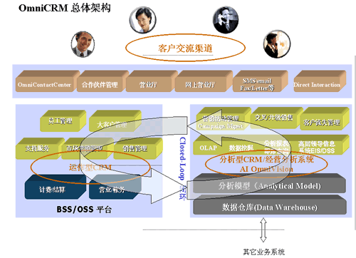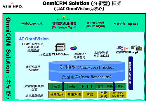 OmniCRM方案是亞信基于多年服務電信市場的豐富的行業(yè)經(jīng)驗,以及對國內運營商業(yè)務發(fā)展的深刻認識而推出的,其中,AI OmniVision是OmniCRM方案中經(jīng)營分析型CRM 的核心產品。AI OmniVision不僅符合行業(yè)業(yè)務規(guī)范,而且基于對客戶行為、競爭環(huán)境,商業(yè)獲利率以及其他參數(shù)的透徹分析,能夠使運營商充分了解現(xiàn)有客戶、識別并關注贏利的客戶組、提高服務質量、確?蛻魸M意度和忠誠度;同時吸引潛在的客戶;加強提供新服務的投資回報率;提高效率、減小成本,以實現(xiàn)業(yè)務價值的最大化。AI OmniVision采用數(shù)據(jù)倉庫、ETL、OLAP分析、靈活報表展現(xiàn)及數(shù)據(jù)挖掘等技術,包含了用戶分析、業(yè)務分析、收益分析、大客戶分析、營銷分析、競爭分析、服務質量、新業(yè)務分析等眾多功能模塊。