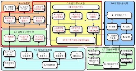 AIOpenCRM將重點支持客戶/市場層面的服務(wù)開通、服務(wù)保障的內(nèi)容,具體包含了市場營銷、銷售及訂單管理、提升客戶關(guān)系、計費帳務(wù)處理、服務(wù)開通管理、服務(wù)報障管理這六個高層流程的前三個。如下圖: