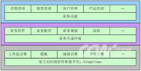 從總體上看AIOpenCRM定位為一個業(yè)務(wù)生成平臺,它分為三個部分,一個基于各種中間件(AIAppFrame、WorkFolw、BusinessRule等)實現(xiàn)的業(yè)務(wù)生成環(huán)境,第二個是基于業(yè)務(wù)邏輯數(shù)據(jù)模型實現(xiàn)的業(yè)務(wù)對象,最后是基于業(yè)務(wù)生成環(huán)境以及業(yè)務(wù)對象實現(xiàn)的業(yè)務(wù)功能。它們都是基于J2EE技術(shù)進行實現(xiàn)的。如下圖所示:
