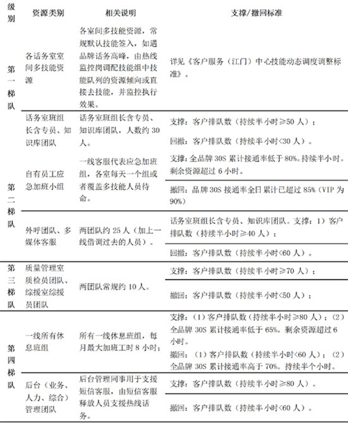 第一梯隊(duì):側(cè)重現(xiàn)有話務(wù)科室間“技能協(xié)同”,適度放棄某些品牌,重點(diǎn)保障某品牌;同時一線班組長和日常負(fù)責(zé)業(yè)務(wù)知識管理的同事入線,承接普通話務(wù)。