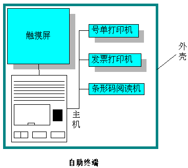 自助終端的結構主要分為6個部分:主機、觸摸屏、條形碼閱讀機、號單打印機、發(fā)票打印機和外殼。