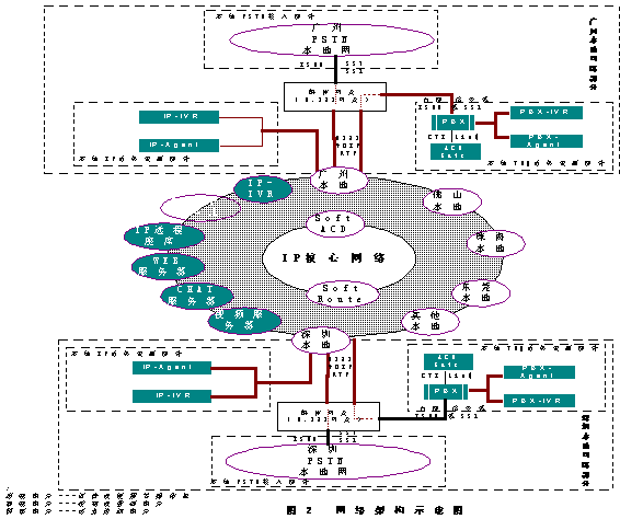從網(wǎng)絡(luò)架構(gòu)示意圖2中可以看到,每一個PSTN本地網(wǎng)都是通過H323媒體網(wǎng)關(guān)連接到IP包交換網(wǎng)絡(luò),再接入到呼叫中心系統(tǒng)中來的,包括廣東省內(nèi)各個比較重要的城市(如深圳,珠海,中山,東莞等等)都可以設(shè)一個H323媒體網(wǎng)關(guān).同時所有的話務(wù)資源(如多媒體座席和IP-IVR系統(tǒng))都是直接通過IP網(wǎng)絡(luò)連接到呼叫中心系統(tǒng)中來的.