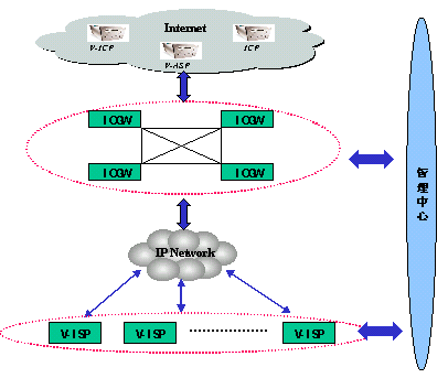整個(gè)語(yǔ)音互聯(lián)網(wǎng)由V-ISP接入服務(wù)平臺(tái)、ICGW信息控制關(guān)口、V-ICP內(nèi)容提供平臺(tái)、管理平臺(tái)四部分組成。這四部分分別完成不同的功能。