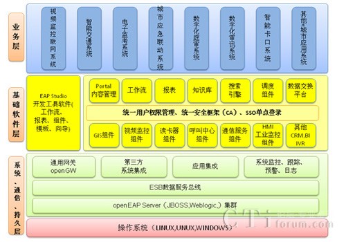 2)標準化技術架構:集成主流應用服務器Jboss、spring、Hibernate等開源框架;符合SOA技術架構;