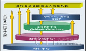 應用軟件可以是基于硬件平臺、操作系統(tǒng)、基礎軟件架構平臺(比如J2EE中間件,Bea Weblogic, IBM WebSphere等)、業(yè)務基礎軟件平臺這幾個不同的層次來開發(fā)實現(xiàn)的。目前大多數(shù)應用軟件開發(fā)商都是基于操作系統(tǒng)或基礎軟件架構平臺這兩個層次上來直接構建應用軟件,而沒有一個通用的、開放的、擴展能力強的業(yè)務軟件開發(fā)平臺來支持,比較難滿足呼叫中心業(yè)務軟件在個性化、靈活、可重用方面需求。