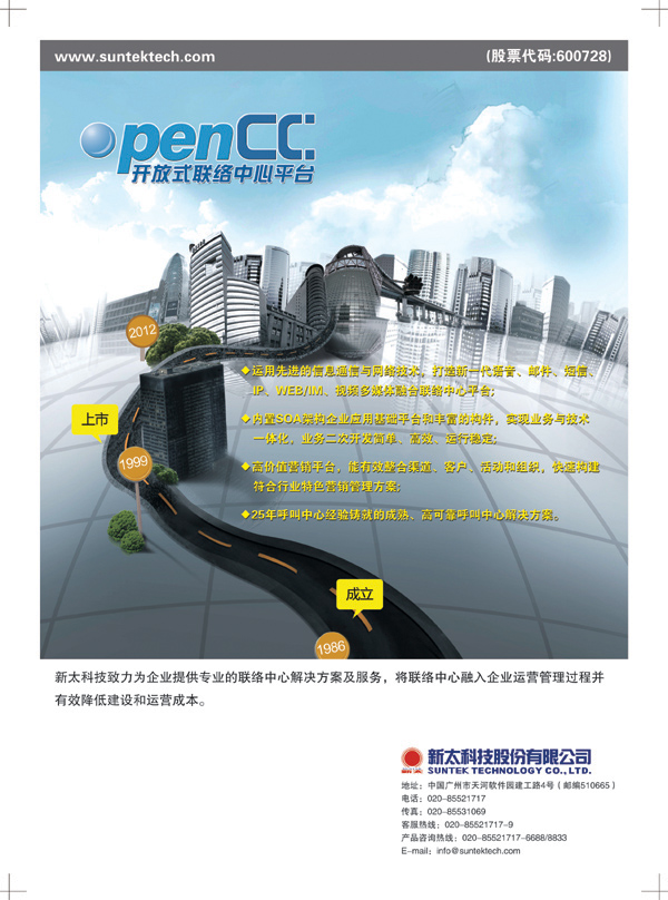 目前,新太科技的業(yè)務集中在現(xiàn)代信息服務業(yè)的三個主要領域發(fā)展,包括電信增值領域、呼叫中心領域和監(jiān)控安防領域、IT服務領域(包括電信平臺維保業(yè)務、云計算產品集成服務、軟件外包及一站式供應鏈管理服務),并在過去的兩年中得到了全面提升和快速發(fā)展。近期承接了一系列國家級電信增值業(yè)務平臺項目、廣州亞運會工程項目、廣州市及番禺區(qū)平安城市視頻監(jiān)控與安防系統(tǒng)項目。