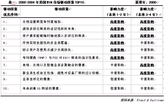 根據(jù)Frost & Sullivan 分析預(yù)測,2000-2004年美國WIN設(shè)備市場呈現(xiàn)相對均衡的發(fā)展趨勢,其TOP10的影響因素與影響力度見下表: