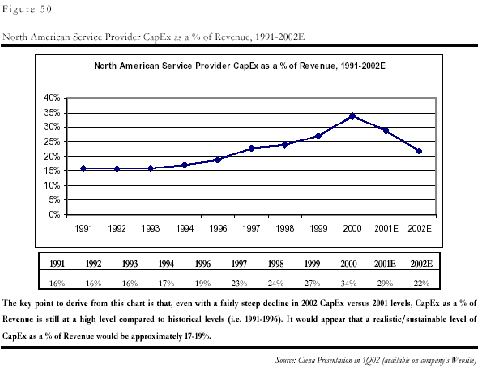 和中國的問題一樣,制造商的問題是電信服務(wù)企業(yè),即運營商的投入減少造成的。由于上世紀(jì)末互聯(lián)網(wǎng)和電子商務(wù)泡沫的虛假繁榮的影響,各運營商都嚴(yán)重高估了市場需求,認(rèn)為需求是會隨著通信能力的增強(qiáng)無限增加,因此市場規(guī)模是會無限擴(kuò)張的,他們在缺乏對最終用戶需求的深入分析的前提下,普遍在基礎(chǔ)設(shè)施的建設(shè)上進(jìn)行了超大規(guī)模的投入,其基礎(chǔ)設(shè)施建設(shè)投入在收入中的比例一度在2000年從平均的15%達(dá)到了創(chuàng)記錄的35%!