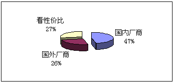 (5)向誰購買:鑒于國內(nèi)并沒有知名度很高的CRM實(shí)施廠商,而國外的著名廠商在國內(nèi)的品牌宣傳也不足,所以我們的調(diào)查表中只設(shè)了:國內(nèi)廠商、國外廠商和根據(jù)性價(jià)比進(jìn)行選擇三個(gè)項(xiàng)目,與購買能力對(duì)照,預(yù)期實(shí)施金額在100萬以下的企業(yè),一般側(cè)重國內(nèi)廠商,而實(shí)施金額在100萬以上企業(yè)則側(cè)重國外企業(yè)。