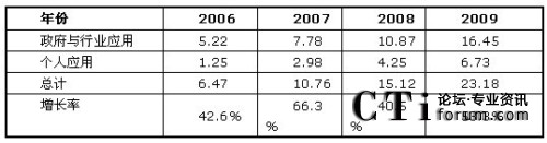 如圖1所示,F(xiàn)rost & Sullivan認為,由于個人應(yīng)用領(lǐng)域的商業(yè)模式還未成熟,產(chǎn)業(yè)鏈整合仍在進行中,目前移動位置服務(wù)應(yīng)用仍然以政府和企業(yè)應(yīng)用為主。如圖4所示,2009年個人應(yīng)用市場規(guī)模為6.73億元,而政府與行業(yè)應(yīng)用市場達到16.45億元,兩者總計達23.18億元,同比去年增長了53.3%。