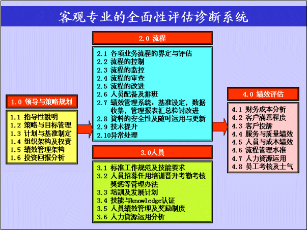 此評估診斷系統(tǒng)以1.0領(lǐng)導與決策規(guī)劃為起始點,作為建立一個以客戶為核心的高質(zhì)量客戶服務中心的推動根源,并且制定了一個良好的4.0績效評估系統(tǒng),以確保經(jīng)營目標與標準質(zhì)量基準能確實達成,此過程需透過嚴謹?shù)牧鞒淘O(shè)計和高效的人員管理去執(zhí)行這套運營體系。