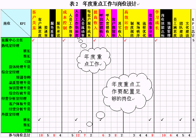 在這里,我們先以崗位設(shè)計來舉例。經(jīng)常有呼叫中心主管把每個崗位的職責(zé)都設(shè)計的非常詳細(xì),包括了每天來做什么,說什么,錄入什么,甚至是打掃某區(qū)域衛(wèi)生之類。但是,我看遍了每一條,也沒找到這個崗位應(yīng)該對什么業(yè)績"負(fù)責(zé)任",該對哪些工作做出貢獻(xiàn)。此處建議各位把效益評價體系、年度重點(diǎn)工作與崗位設(shè)計結(jié)合起來。如表2所示,我們可以把效益評價體系作為KPI放在橫坐標(biāo)中,而崗位設(shè)置則是縱坐標(biāo)。每個崗位對應(yīng)的行中,可以勾畫其應(yīng)負(fù)責(zé)或者做出主要貢獻(xiàn)的項目。這些項目不能超過6個,因?yàn)樘嗟捻椖繒沟眠@個崗位無所適從,最終的結(jié)果是哪個也沒做好。當(dāng)你勾畫完成之后,請計算每列的"對勾"數(shù)目,看看你本年度的重點(diǎn)工作是不是有較多崗位負(fù)責(zé)呢?