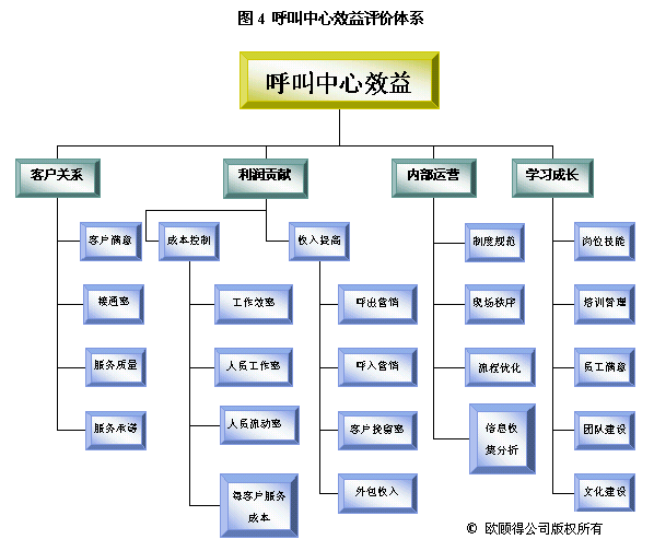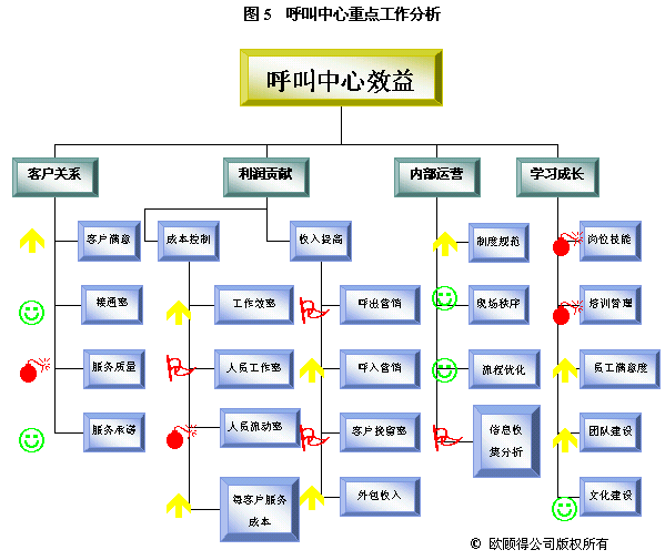 根據(jù)年度重點(diǎn)工作及目標(biāo),我們就可以設(shè)計關(guān)鍵措施來使其實(shí)現(xiàn)。通常一項關(guān)鍵措施可以有助于幾個目標(biāo)的達(dá)成。如建立培訓(xùn)體系,可以使得在崗培訓(xùn)、上崗培訓(xùn)、多技能訓(xùn)練以及崗位技能達(dá)標(biāo)率有所提升,而體現(xiàn)在業(yè)務(wù)上的效果則是服務(wù)質(zhì)量的提升、呼出營銷收入增加和客戶挽留率提高。