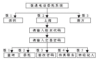 通過(guò)該項(xiàng)服務(wù),股民可以在任何地點(diǎn)使用任何一部雙音頻電話方便的向證券公司發(fā)出買入、賣出等各種委托指令,也可以發(fā)出查詢指令,證券公司的電話委托交易系統(tǒng)根據(jù)股民的指令自動(dòng)完成委托及查詢操作,將結(jié)果反饋給股民。股民發(fā)給證券公司的信息,主要為數(shù)碼、數(shù)字,通過(guò)雙音頻電話按鍵來(lái)傳送。證券公司電話委托交易系統(tǒng)發(fā)給股民的信息,則是用語(yǔ)音傳送的操作及查詢結(jié)果。通過(guò)功能擴(kuò)充,還可提供其它配套服務(wù),如將查詢結(jié)果發(fā)送至股民的傳真機(jī)。若股民利用計(jì)算機(jī)接至委托公司,還可享受可視委托等更為多樣的服務(wù)。