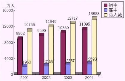 2001年,中國大陸中學(xué)學(xué)生人數(shù)已達(dá)10765萬人,而且學(xué)生人數(shù)還在快速增長。初中學(xué)生人數(shù)以每年6.5%的速度增長,普通高中學(xué)生人數(shù)也以每年10%-11%的速度增長?梢钥闯,教育市場巨大的潛力和商機。