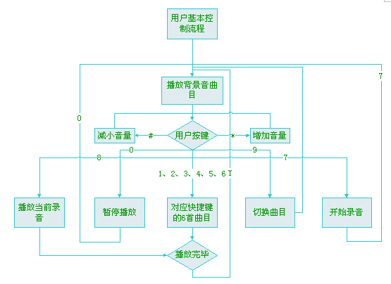 用戶設定:用戶可以通過語音自動導航或者通過上網(wǎng)來自主選擇并設定背景音效,并把其中最常用的六種音效對應1~6號按鍵,這樣用戶在自己使用的過程中就可以根據(jù)當時的情況使用自己喜歡的背景音效了。