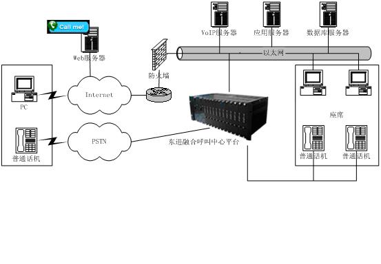 to Talk)”發(fā)展到“點擊到交談(Click to Talk)”,通過Internet可以提供IP電話語音呼叫、Call Back、IP傳真、IM、E-mail等功能,擴展了通信渠道,一方面用戶可以實現(xiàn)免費接入到呼叫中心,另一方面企業(yè)能夠向更多的客戶提供優(yōu)質、方便的服務資源,而且由于這些資源的價格相對傳統(tǒng)通信便宜,使企業(yè)為客戶提供全國、乃至于全球服務成為可能,提高了企業(yè)客戶服務水平,增強了企業(yè)競爭力。東進互聯(lián)網(wǎng)呼叫中心系統(tǒng)結構如圖所示: