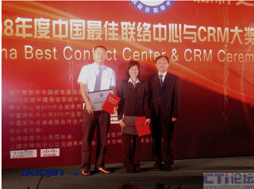 “2008中國最佳聯(lián)絡(luò)中心及CRM評獎”是由中國唯一的國家級呼叫中心與BPO行業(yè)協(xié)會--中國呼叫中心與BPO產(chǎn)業(yè)聯(lián)盟(CNCBA) 與呼叫中心與BPO行業(yè)資訊網(wǎng)(51 Callcenter)、中國軟件與服務(wù)外包產(chǎn)業(yè)聯(lián)盟共同主辦,代表中國唯一接軌全球最佳聯(lián)絡(luò)中心評選標(biāo)準(zhǔn),是工業(yè)和信息化部唯一認(rèn)可的行業(yè)獎項(xiàng),為真正意義上的中國聯(lián)絡(luò)中心“奧斯卡”獎。參選對象為中國行政區(qū)域內(nèi)的各類政府、企事業(yè)單位聯(lián)絡(luò)中心、客戶服務(wù)中心、客戶支持中心、客戶聯(lián)絡(luò)中心、以及同類含義的職能部門及其從業(yè)人員等。因此,無論是從獎項(xiàng)的規(guī)格還是入選的圍度都是非常高規(guī)格與嚴(yán)格的。東進(jìn)技術(shù)的多媒體呼叫中心系統(tǒng)平臺解決方案在此次評選中經(jīng)過了用戶、業(yè)界同仁與專家學(xué)者的一致認(rèn)可,最終獲得了這一殊榮。