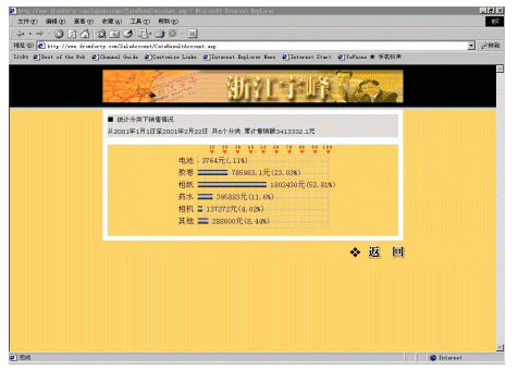 宇峰公司(www.fromforty.com)是柯達(dá)(中國)有限公司在中國華東地區(qū)的總代理,負(fù)責(zé)管理華東地區(qū)近600個(gè)分銷商和連鎖店。公司非常重視信息化建設(shè),添設(shè)了大量的計(jì)算機(jī),建立起初步的管理系統(tǒng)。但是直到2000年還是依靠E-mail傳遞大量的Excel表格獲取需要的產(chǎn)品銷售和庫存的信息。這些表格對各級(jí)分銷商查詢和統(tǒng)計(jì)數(shù)據(jù)來說非常麻煩,因?yàn)槊恐芤幚韼装賯(gè)訂購單。整個(gè)處理過程非常緩慢,并且成本很高,也容易造成各種的數(shù)據(jù)錯(cuò)誤。而公司內(nèi)部對業(yè)務(wù)人員銷售情況的統(tǒng)計(jì),也頗為麻煩,因?yàn)橄录?jí)分銷商上報(bào)上來的數(shù)據(jù)準(zhǔn)確性差,并且不夠及時(shí)。處理這些表格對宇峰公司和分銷商以及連鎖店而言都是效率很低的,并且常常令人茫然不知所措。