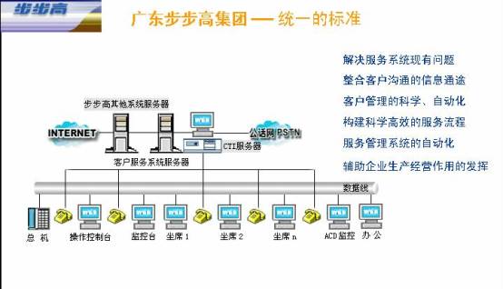 步步高呼叫中心最有效益的應(yīng)用就是在客戶服務(wù)管理系統(tǒng)中發(fā)揮前端強有力的支持作用,它不但給客戶提供高級的交互式服務(wù),而且為業(yè)界確定了新的客戶服務(wù)滿意標準。