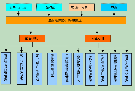 后臺客服應(yīng)用子系統(tǒng)能夠很方便地與前臺呼叫中心整合,以更全面的功能,提供一流的客戶服務(wù)。整個后臺系統(tǒng)包括一系列完善的功能:客戶咨詢/投訴管理、客戶預約服務(wù)受理、客戶回訪/電話營銷、智能檢索知識庫、日歷管理/視圖管理、服務(wù)權(quán)限/流程控制、服務(wù)監(jiān)管/商場管理、備件管理/費用管理、派單管理/單據(jù)管理、客戶/產(chǎn)品分析管理。