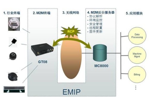 所有的M2M方案都具有的五要素是行業(yè)終端、M2M終端、無線傳輸網(wǎng)絡(luò)、M2M后臺服務(wù)器以及應(yīng)用模塊。為了能快速有效及低成本地適應(yīng)M2M市場上各種各樣的行業(yè)應(yīng)用,愛立信提出智能平臺EMIP的概念(如圖所示)。該智能平臺由GT08系列終端和MC8000管理服務(wù)器組成。