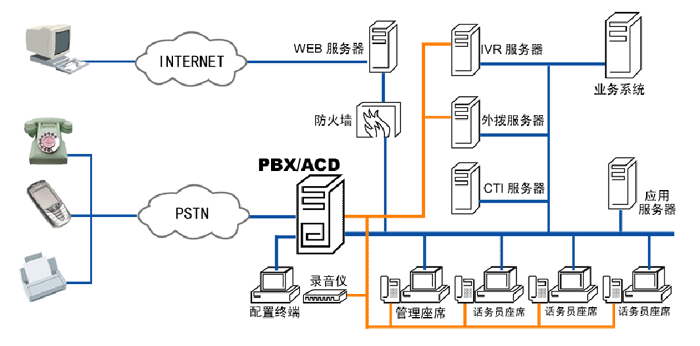 客戶(hù)服務(wù)中心可以形象的理解為客戶(hù)關(guān)懷中心、客戶(hù)聯(lián)系中心、電話服務(wù)中心、客戶(hù)支持中心、服務(wù)熱線等。從技術(shù)的角度看,客戶(hù)服務(wù)中心是一組座席員集中進(jìn)行來(lái)電處理和發(fā)出呼叫與客戶(hù)聯(lián)系的專(zhuān)門(mén)的系統(tǒng)。呼叫中心系統(tǒng)結(jié)構(gòu)為: