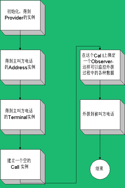 JTAPI利用OBSERVER的概念來進行各種消息處理。OBSERVER直譯過來是觀察者的意思,顧名思義,OBSERVER就是對每個呼叫對象進行“觀察”工作。它的工作流程是“綁定到專門對象》觀察專門對象》獲取專門對象的信息》分析并匯報專門對象的信息”。