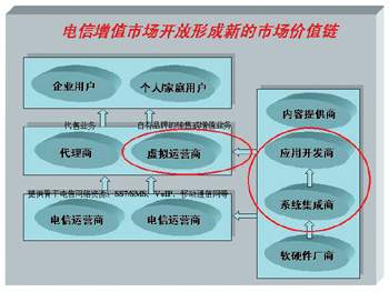 在電信增值市場(chǎng)開(kāi)放的背景之下,新的市場(chǎng)價(jià)值鏈正在形成(如圖所示)。國(guó)內(nèi)電信建設(shè)轟轟烈烈的大規(guī);A(chǔ)設(shè)施投資已是明日黃花,改善應(yīng)用“稀缺”的現(xiàn)狀才是當(dāng)務(wù)之急。李峻認(rèn)為,信息產(chǎn)品技術(shù)服務(wù)提供商最主要的任務(wù),就是幫助運(yùn)營(yíng)商開(kāi)發(fā)針對(duì)中國(guó)市場(chǎng)的增值業(yè)務(wù),并帶動(dòng)其主業(yè)協(xié)同發(fā)展。即面向電信網(wǎng)絡(luò)運(yùn)營(yíng)商以及虛擬運(yùn)營(yíng)商,提供增值業(yè)務(wù)系統(tǒng)整體解決方案及其軟硬件支撐平臺(tái)和應(yīng)用系統(tǒng)。