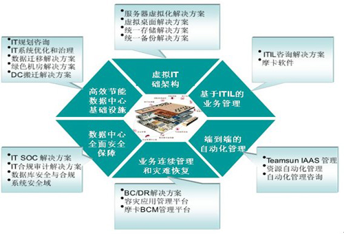 圍繞云計算數(shù)據(jù)中心的建設,華勝天成共開發(fā)了多個解決方案,且每個解決方案均有專業(yè)的售前支持團隊和售后實施團隊,這些解決方案不是分散而無關的,而是針對用戶的不同情況,在各方面均給予綜合考慮,以最優(yōu)的設計方案來滿足用戶的需要,并兼顧另外方面的后繼需求。
