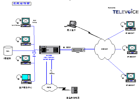 ACC2000通過H.323協(xié)議連接Internet,遠(yuǎn)程人員在任何位置(使用配備聲卡和耳麥的PC)只要登錄Internet即可實現(xiàn)遠(yuǎn)程座席功能.