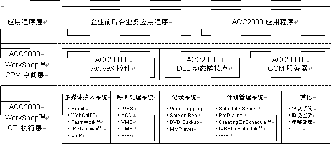 ACC2000 Workshop是聲訊科技集團(tuán)為基于Microsoft Windows操作系統(tǒng)的CRM應(yīng)用軟件開發(fā)所建立的開發(fā)平臺(tái)(中間件)。以ACC2000 Workshop為基礎(chǔ)的ACC2000集成多媒體溝通中心采用三層結(jié)構(gòu),利用ACC2000 Workshop的CRM中間層所提供的ActiveX控件、DLL動(dòng)態(tài)庫(kù)以及COM組件,就可以很容易地將溝通中心的各種功能融合到前端應(yīng)用程序中。ACC2000 Workshop的CTI執(zhí)行層接受中間件發(fā)來的請(qǐng)求,處理ACC2000的各項(xiàng)服務(wù)功能,并向CRM應(yīng)用程序返回執(zhí)行結(jié)果。見下圖。