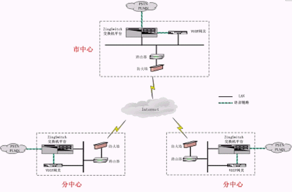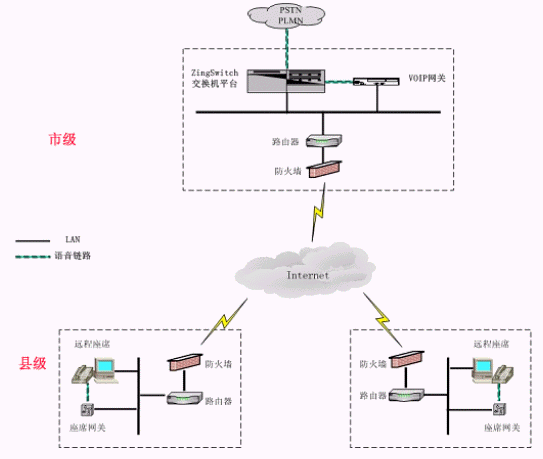 系統(tǒng)在市中心點(diǎn)和分布的遠(yuǎn)程座席所在縣市區(qū)分別部署相應(yīng)的VoIP網(wǎng)關(guān),市中心和各個(gè)縣市區(qū)都通過(guò)互聯(lián)網(wǎng)進(jìn)行連接和語(yǔ)音傳輸,客戶(hù)與遠(yuǎn)程座席之間的交流與普通的集中座席員之間毫無(wú)區(qū)別,遠(yuǎn)程座席只相當(dāng)于ZingSwitch交換機(jī)的一個(gè)遠(yuǎn)程分機(jī)。