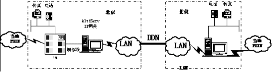 3、系統(tǒng)結(jié)構(gòu):北京新浪在Nortel交換機(jī)與AltiServ網(wǎng)關(guān)之間采用模擬線連接,AltiServ通過(guò)網(wǎng)卡接入LAN后,再通過(guò)數(shù)層路由器接入北京與北美的DDN專線。