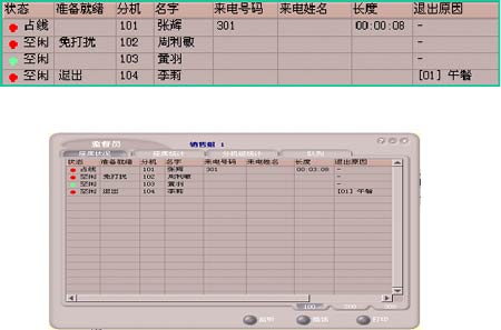 班長(zhǎng)席子系統(tǒng)除了話務(wù)席子系統(tǒng)中所介紹的全部功能外,還具有監(jiān)聽(tīng)、錄音、強(qiáng)拆電話、攔截呼叫、話務(wù)席監(jiān)控、話務(wù)工作量統(tǒng)計(jì)等座席管理功能。