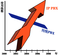 "2005年IP-PBX的使用線(xiàn)數(shù)將超過(guò)傳統(tǒng)PBX。從2001年開(kāi)始傳統(tǒng)PBX以每年12%的速度在下降,IP-PBX以每年30%的速度增長(zhǎng)"。