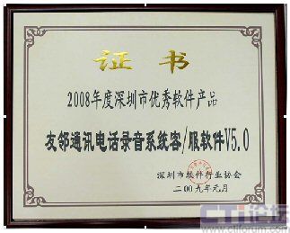 2009年1月,友鄰通訊電話錄音系統(tǒng)客/服軟件V5.0 榮獲由深圳市軟件行業(yè)協(xié)會頒發(fā)的“2008年度深圳市優(yōu)秀軟件產(chǎn)品”榮譽證書!2008年度深圳市優(yōu)秀軟件產(chǎn)品”的評選是深圳市軟件行業(yè)協(xié)會在全市范圍內(nèi)舉辦的軟件產(chǎn)品推優(yōu)活動,經(jīng)過了企業(yè)申報、技術資料審核、專家評審等等幾大嚴格篩選程序。