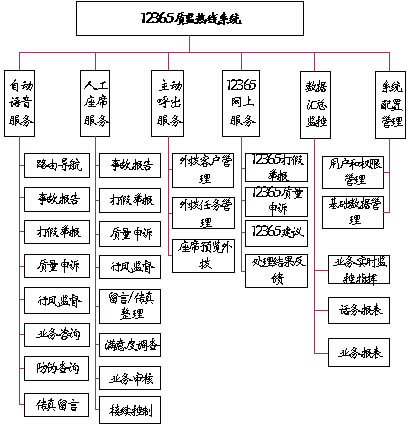 系統(tǒng)主要功能有:事故報告、打假舉報、質量申訴、行風監(jiān)督、業(yè)務咨詢、防偽查詢、主動呼出、網(wǎng)上服務、統(tǒng)計分析、數(shù)據(jù)匯總監(jiān)控等。