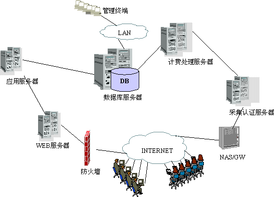 根據(jù)以上體系結(jié)構(gòu),寬帶IP城域網(wǎng)計費(fèi)與業(yè)務(wù)管理系統(tǒng)的運(yùn)行平臺結(jié)構(gòu)如圖所示: