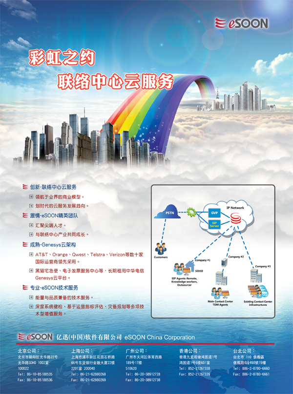 億迅(中國)軟件有限公司:"億迅(中國)軟件有限公司(eSOON)"是eSOON Cayman 集團控股公司與eSOON BVI投資營運公司在中國大陸投資的全資子公司,也是其拓展大中國區(qū)業(yè)務(wù)的據(jù)點。自2001年在上海成立至今,已在全國各地14個城市設(shè)有分公司或辦事處,為超過350家的客戶提供本地化的呼叫中心系統(tǒng)建設(shè)和運營管理的專業(yè)服務(wù),其中不乏橫跨各個領(lǐng)域的頂尖企業(yè)。億迅一直秉承客戶至上的服務(wù)精神融入企業(yè)的業(yè)務(wù)發(fā)展和日常經(jīng)營中。