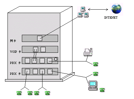 圖中假設(shè)客戶安裝了兩塊PBX板卡和一塊VOIP板卡,產(chǎn)品的板卡都插在計算機主板上的插槽上。系統(tǒng)的布線如圖所示,PBX板卡上有外線端口和分機端口(ISA型號的每個插口接4條線、PCI型號的每個插口接2條線),外線接在外線端口上,分機線接在分機端口上。VOIP板卡有2個插口,每個插口接2條線。用戶如果要使用VOIP功能,需要從分機端口接出線到VOIP端口中。客戶使用網(wǎng)絡(luò)電話時,只要呼叫連接VOIP端口的分機號碼即可撥通網(wǎng)絡(luò)電話。