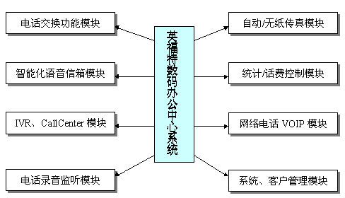 模塊包括:一號通功能、語音留言、留言通知功能、客戶通過密碼遠程登錄控制功能、與電子郵件集成的語音郵件(Voice Mail)系統(tǒng)、群組廣播功能等功能。