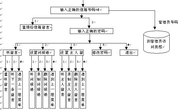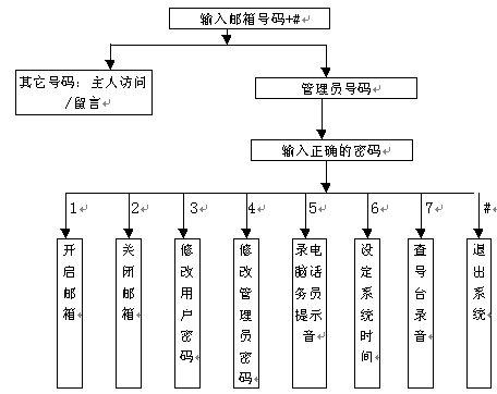 作為信箱主人的用戶既可以象其它普通用戶一樣進(jìn)行普通用戶訪問(wèn)(指訪問(wèn)其它分機(jī)、給其它分機(jī)主人留言等),還可以使用系統(tǒng)專門(mén)提供的主人訪問(wèn)服務(wù)功能。