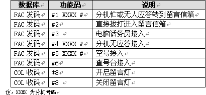 若您要的分機(jī)正在忙或分機(jī)主人不在電話機(jī)旁,可直接轉(zhuǎn)到留言信箱,止項(xiàng)功能要求在交換機(jī)數(shù)據(jù)庫(kù)中設(shè)置分機(jī)遇忙/無(wú)應(yīng)答轉(zhuǎn)移到留言信箱。