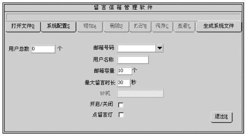 1). 您可修改的參數(shù)有:用戶名稱、用戶密碼、信箱容量、最大留時(shí)長(zhǎng)、開(kāi)啟/關(guān)閉、點(diǎn)留言燈。有關(guān)參數(shù)的細(xì)節(jié)將在增加信箱一節(jié)中介紹。